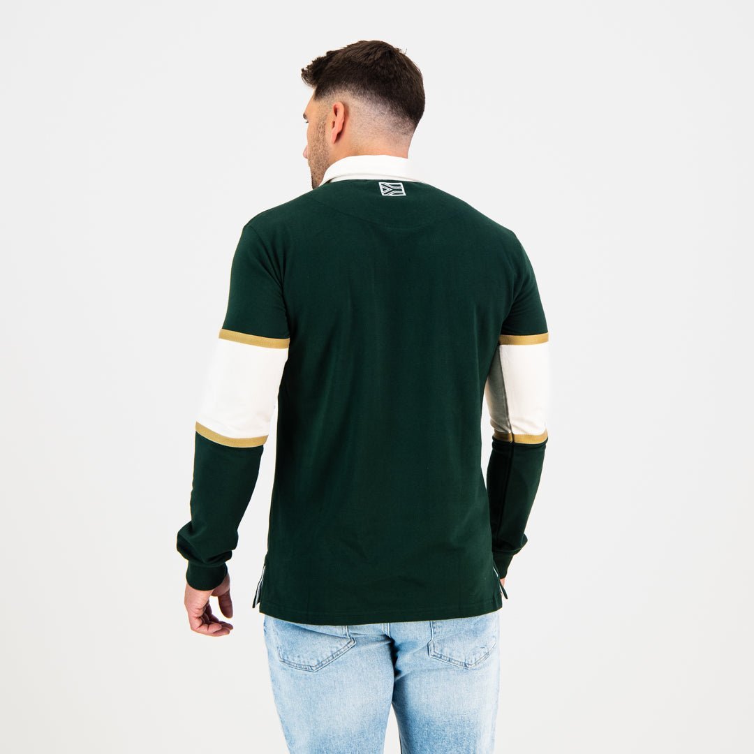 The striking green main color exudes the nation's vibrancy, while the off-white stripe across the chest and arms adds a touch of elegance. Embellished with a thin golden tape on the top and bottom of the white stripe, this design exudes a sense of prestige and style. The back of the jersey maintains the classic green fabric, complemented by a small white outline of the South African flag just below the collar, symbolising unity and pride.