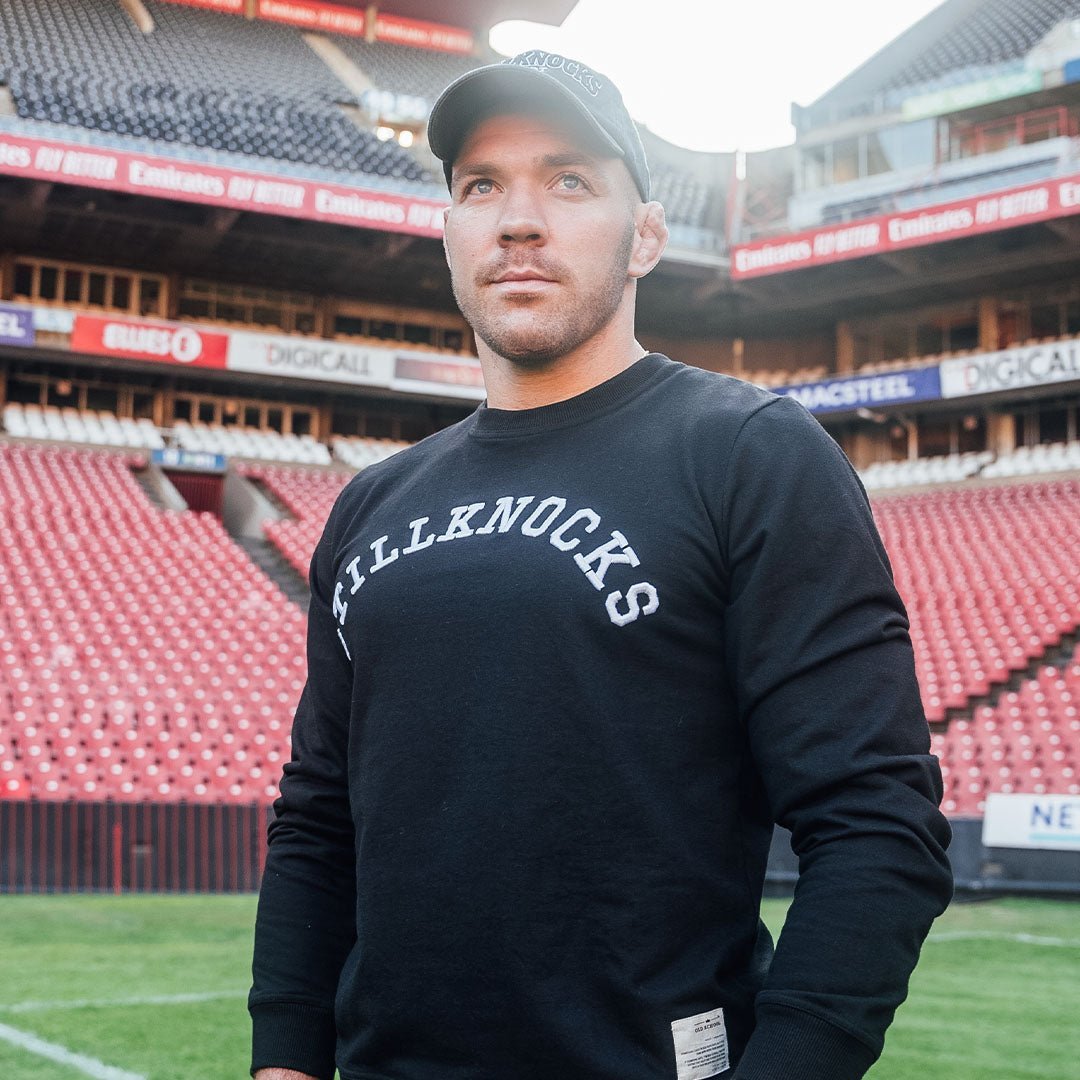 The crew neck features a sleek black main color, representing sophistication and versatility. Adorning the top of the chest is a bold, large half circle Stillknocks logo, meticulously embroidered to make a powerful statement. Its placement adds a unique touch of style and authenticity to this timeless piece.