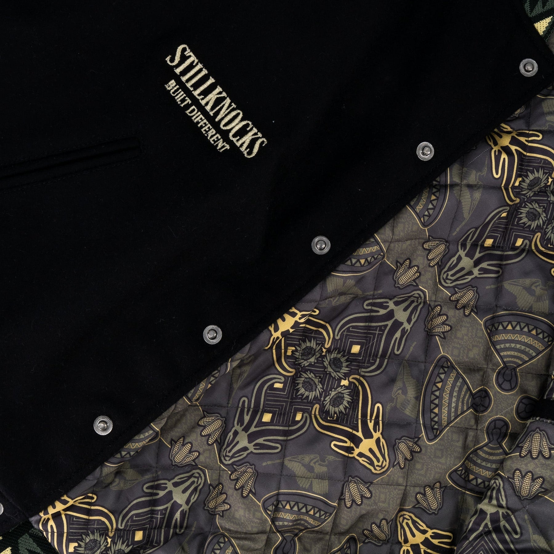 The And Still Stillknocks Legends Bomber Jacket draws deep inspiration from South African heritage, and the second edition takes that even further with a Basotho-inspired printed lining. The rich geometric patterns and intricate designs pay homage to the Basotho people’s craftsmanship and their strong connection to the land. This lining adds an extra layer of cultural significance, blending tradition with the sleek, black leather exterior and gold embroidery. Together, these elements create a jacket that represents not just the fighter’s journey but also the enduring spirit of South Africa itself.